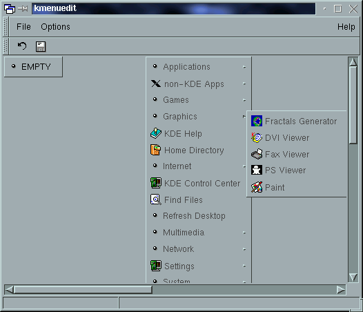 If you don't like the position of these menus in the window, hold down the shift key and the middle mouse button and move the menu arround. The position of the base menus will be saved for the next time you start KMenuedit.