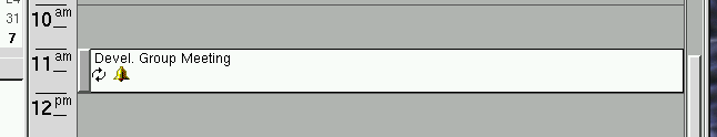 This view allows you to see all your appointments for the day in list-type arrangement. Appointments are displayed one per line. The first column of the appointment will have a bell icon displayed in it if an alarm is set for the appointment. The second column will display a chasing-arrows icon if the appointment repeats multiple times. Holding the mouse over the arrows icon will bring up a tooltip with more detailed recurrence information. The third column displays start and end time information, and the fourth column gives a summary of the appointment.