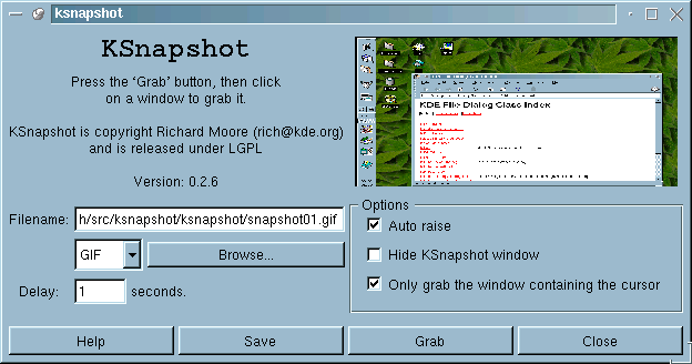 Taking a snapshot is easy, just press the 'Grab' button and KSnapshot will capture an image. A small preview of the captured image is shown in the KSnapshot window and you can see the image at it's full size if you left click on the preview image.