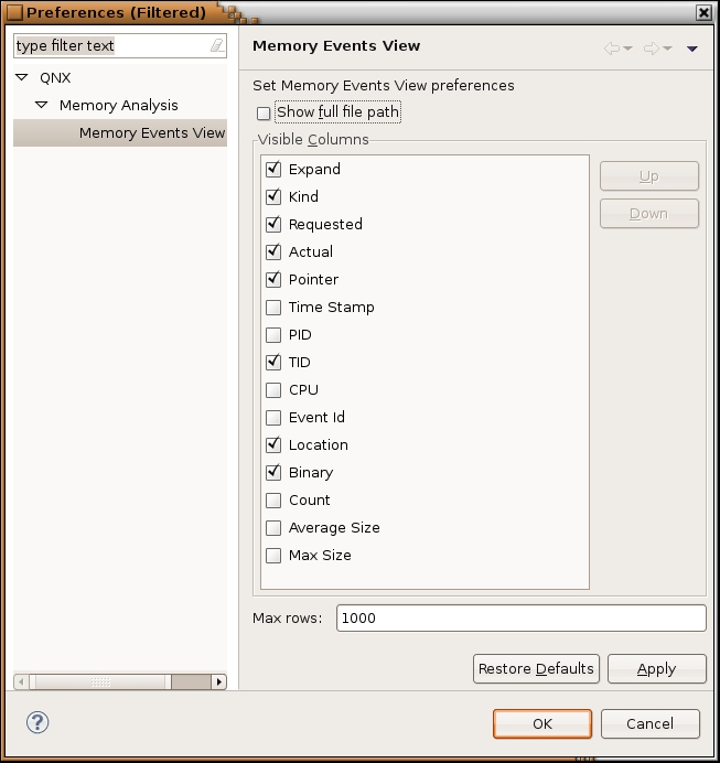 Memory Events Preferences lets you control the look of the Memory Events view. You can select the columns you want to see in the view, as well as some other preferences. You can open the view preferences from global preferences ( , or from the view Preferences… action.