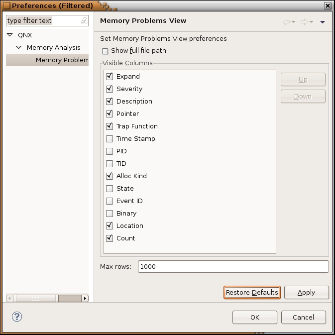 Memory Problems Preferences lets you control the look of the Memory Problems view. You can select the columns you want to see in the view, as well as other preferences. You can open view preferences from global preferences ( , or from the view Preferences… action.