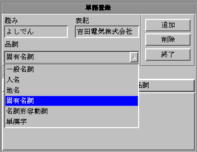 Word registration is now completed. Click 終了(Done) to exit the word registration dialog. The next time you enter the phonetics よしでん (yoshiden), VJE will convert it into 吉田電気株式会社.
