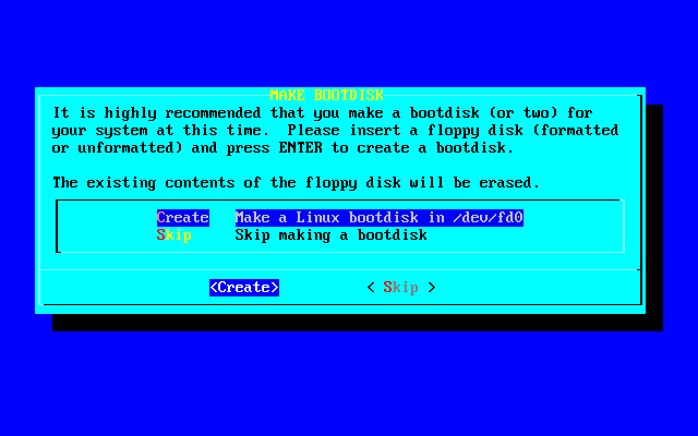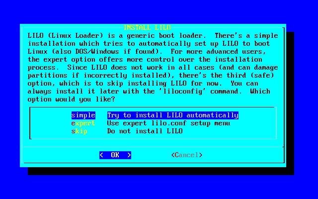 Making a boot disk for future use is probably a good idea. You will have the option of formatting a floppy and then creating one of two types of boot disk. The first type, simple, simply (go figure) writes a kernel to the floppy. A more flexible (and highly recommended) option is lilo, which will of course create a lilo boot disk. See LILO in Section 7.1 for more information. Of course, you may also choose to simply continue, in which case no boot disk will be made.