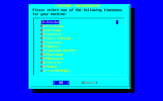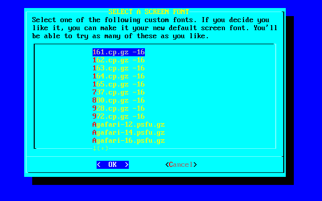 The setup process goes something like this: You step through each option in the setup program, in the order they are listed. (Of course, you are free to do things in almost any order you choose, but chances are it isn't going to work out very well.) Menu items are selected using the up and down arrow keys, and the “Okay” and “Cancel” buttons can be chosen by using the left and right arrow keys. Alternatively, each option has a corresponding key, which is highlighted in the option name. Options which are flaggable (those indicated with a [X]) are toggled using the spacebar.
