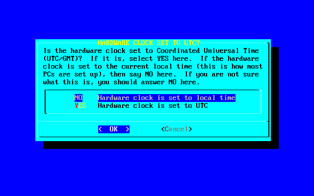 This subsection asks if your computer's hardware clock is set to Coordinated Universal Time (UTC or GMT). Most PCs are not, so you should probably say no.