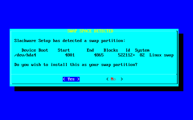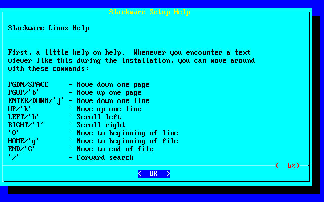 If this is your first time installing Slackware, you might want to take a look at the help screen. It will give a description of each part of setup (much like the one we're writing now, but less involved) and instructions for navigating the rest of the install.