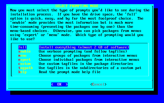 The full option will install every package from all the software series that you chose in the “select” section. There is no further prompting. This is the easiest installation method, since you do not need to make any decisions on the actual packages to install. Of course, this option also takes up the most hard drive space.