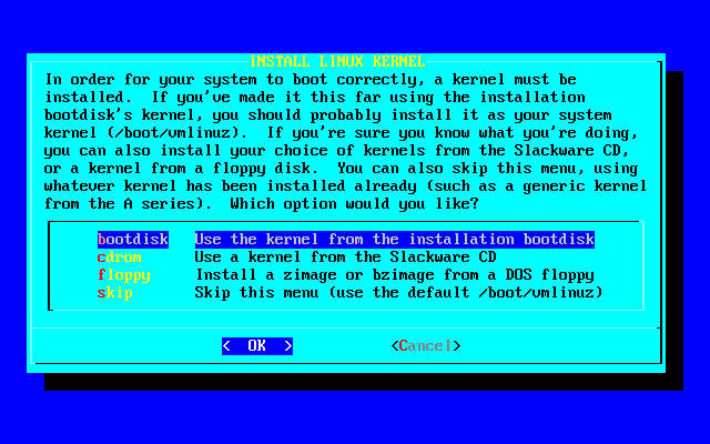 Here you will be asked to select a kernel to install. You can install the kernel from the boot disk you used to install, the Slackware CD-ROM, or from another floppy which you (always thinking ahead) have prepared. Or you can elect to skip, in which case the default kernel will be installed and play will continue to the dealer's left.