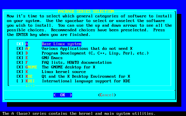 For the more advanced user, install offers the expert option. This allows you complete control over what packages get installed. You can deselect packages that are absolutely required, resulting in a broken system. On the other hand, you can control exactly what goes onto your system. Simply select the packages from each series that you want installed. This is not recommended for the new user, as it is quite easy to shoot yourself in the foot.