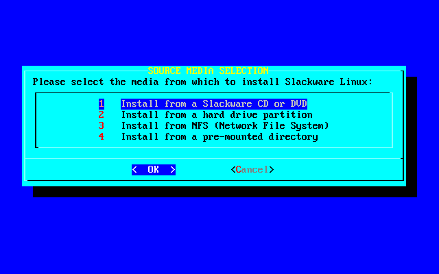 The source section is where you select the source media from which you are installing Slackware. Currently there are four sources to choose from. These are CD-ROM, NFS, or a premounted directory.
