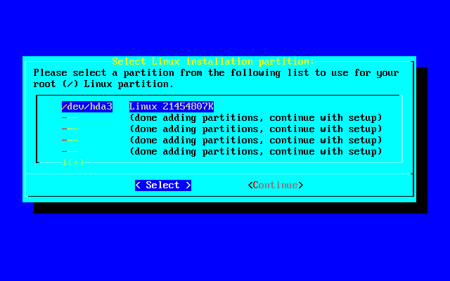 The first option in the target section is the selection of a partition on which to install your root (/) filesystem. After that, you will be able to map other partitions to filesystems as you choose. (For instance, you may want your third partition, say /dev/hda3, to be your home filesystem. This is just an example; map the partitions as you see fit.)